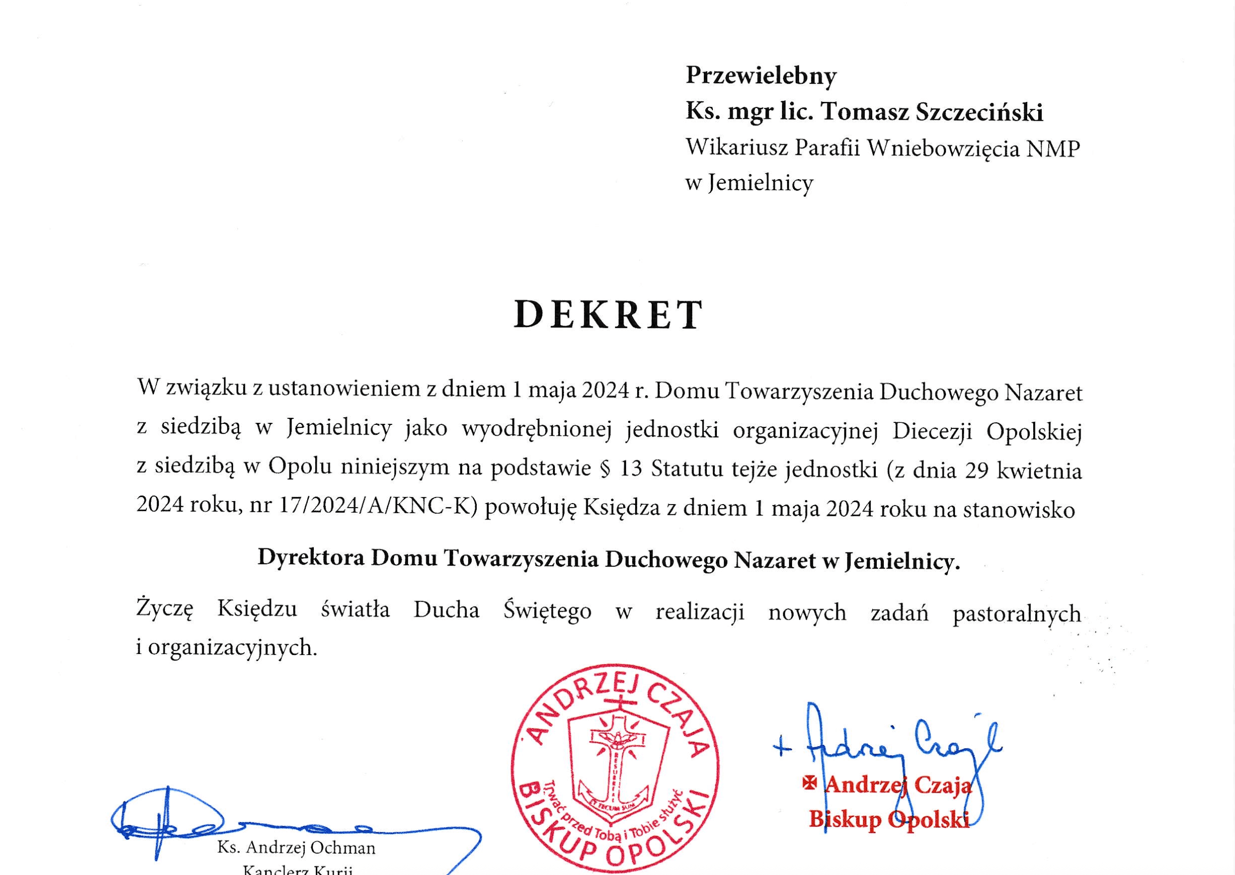 W sobotę 15 listopada 2025 r. biskup opolski Andrzej Czaja poświęcił kaplicę w Domu Towarzyszenia Duchowego Nazaret w Jemielnicy. Nowo utworzona kaplica otrzymała wezwanie Dzieciątka Jezus. Chcemy, żeby tutaj było jak w Domu Nazaretańskim, gdzie Dzieciątko Jezus było czczone. Chcemy to godnie czynić wraz z Maryją i św. Józefem, a dzięki czci oddawanej Jezusowi w znaku figury Dzieciątka chcemy owocować, przynosić więcej pożytku ludziom, którzy przychodzą do naszego domu po pomoc duchową.